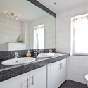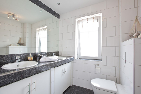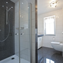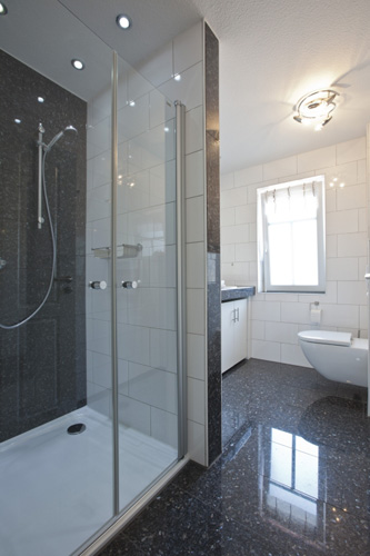Große Wellnessdusche mit LED Beleuchtung, Villeroy & Boch Hänge-WC, Waschtischkombination mit zwei Waschbecken in Blue Pearl Granit Platte eingesetzt inklusive großem Spiegel. Zusätzlicher Kosmetikspiegel, Philips Salon Dry Fön & eine Glaswaage sind vorhanden. Der Fußboden wird über eine elektronische Fußbodenheizung beheizt und ist mit Granit ausgelegt. Eine Handtucherwärmung ist vorhanden. |